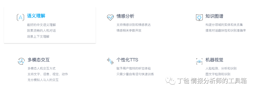 利用从动机械进修更快地开辟模子。供给语义理解、感情阐发、学问图谱、机械视觉、多模态交互、个性化TTS等功能。